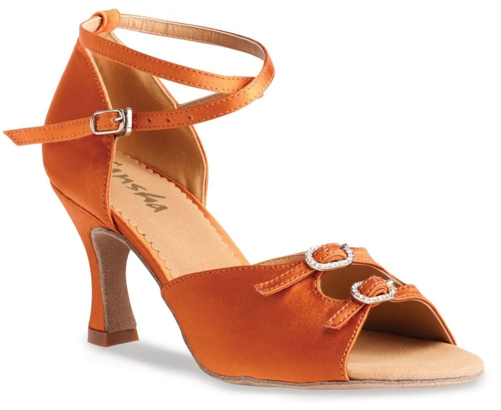 Schuhe für lateinamerikanische Tänze. Der Absatz ist 7,4 cm hoch. Das Obermaterial ist aus Satin, die Sohle aus Wildleder. Vorteilhaft ist die Möglichkeit, die Schuhweite zu regulieren.