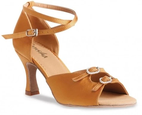 Schuhe für lateinamerikanische Tänze. Der Absatz ist 7,4 cm hoch. Das Obermaterial ist aus Satin, die Sohle aus Wildleder. Ein Vorteil ist die Möglichkeit, die Schuhweite zu regulieren.