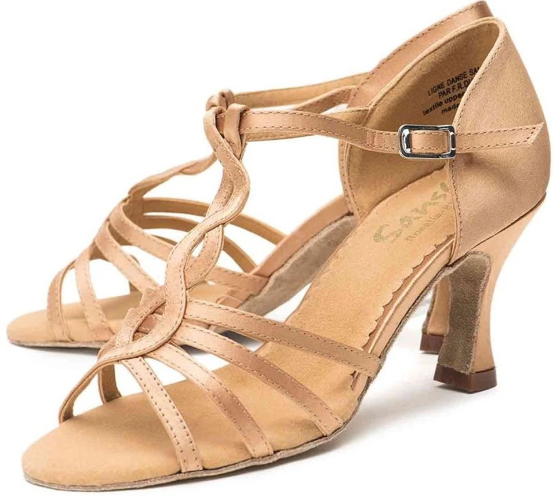 Wunderschöne, romantisch wirkende Schuhe für lateinamerikanische Tänze vom Hersteller Sansha. Der Absatz ist 7,4 cm hoch. Das Obermaterial ist hochwertiger Satin, die Sohle ist aus feinem, bequemem, gebürstetem Leder.