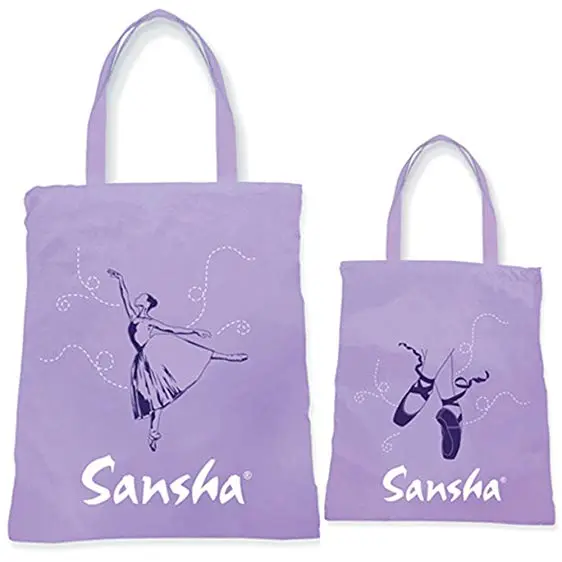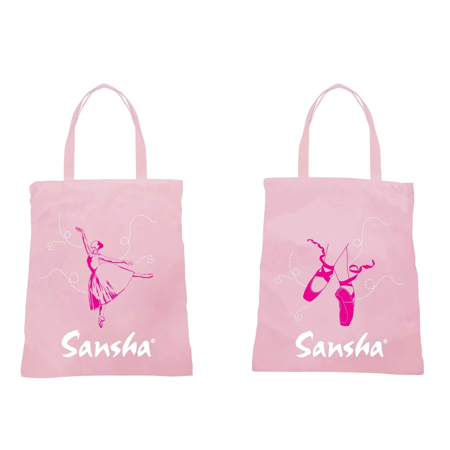 Rosa Tasche für Kinder. Auf der einen Seite ist ein Bild einer Ballerina, auf der anderen sind Ballett-Spitzenschuhe. Maße: 29x34 cm.