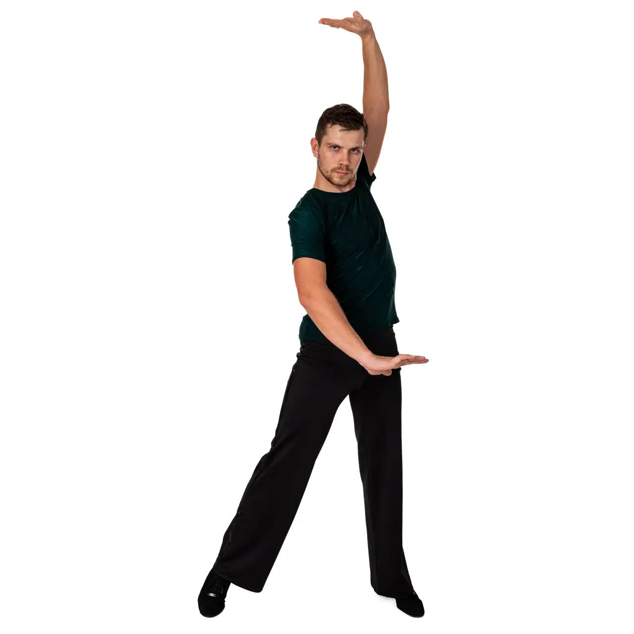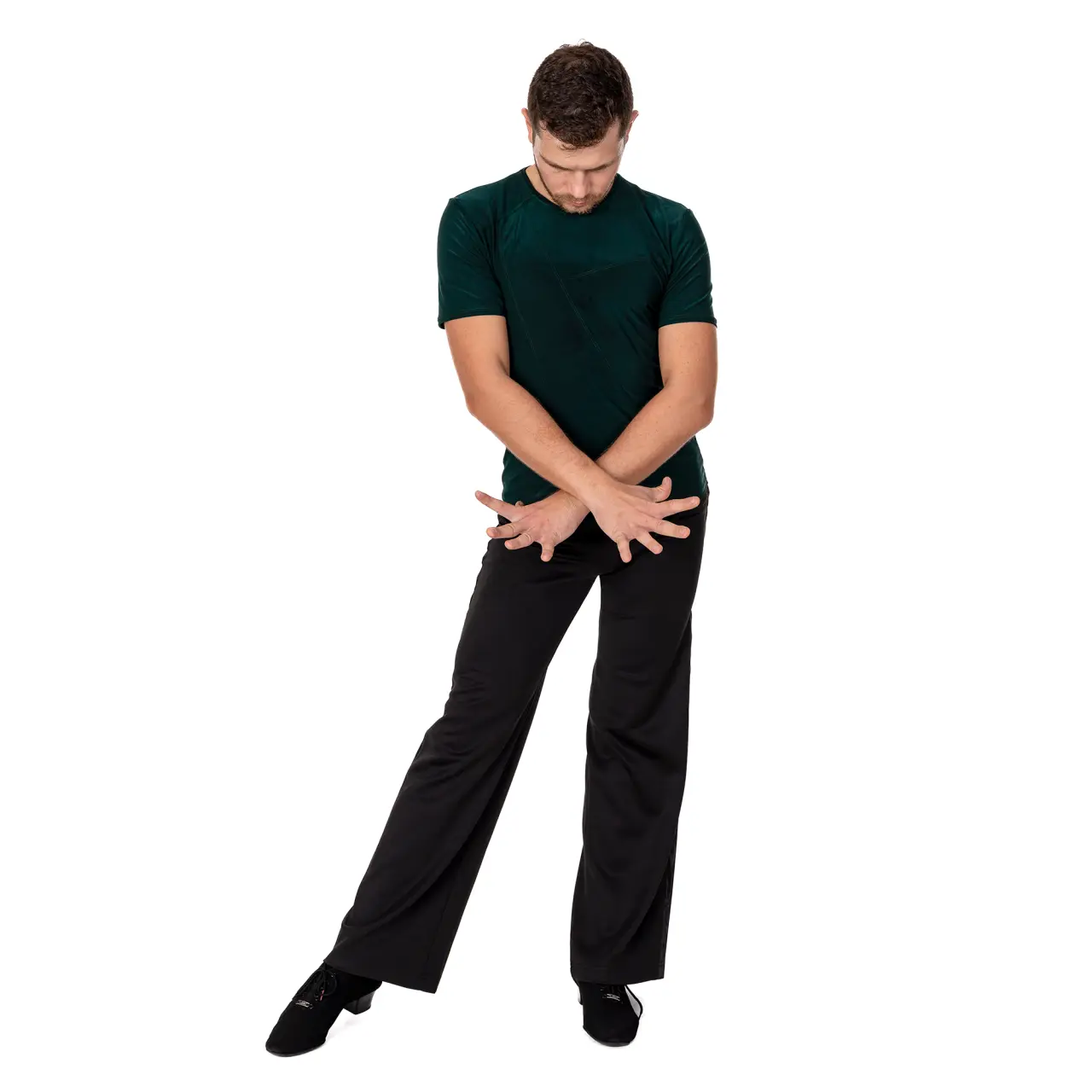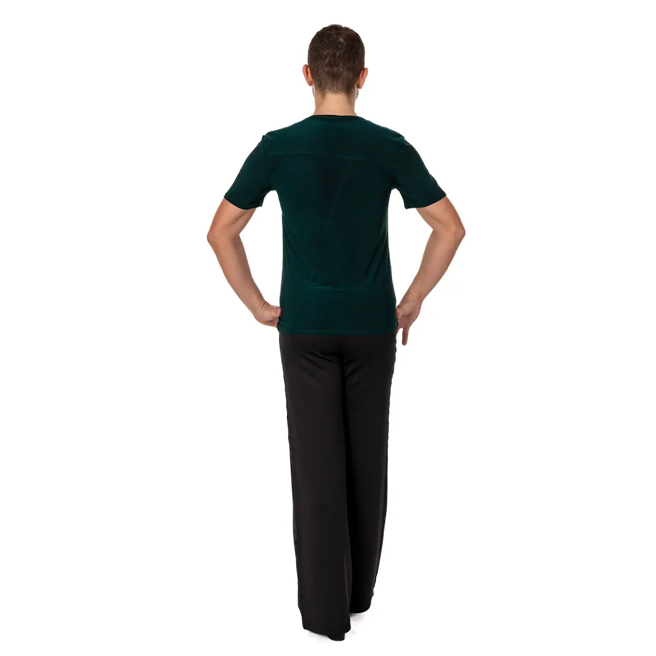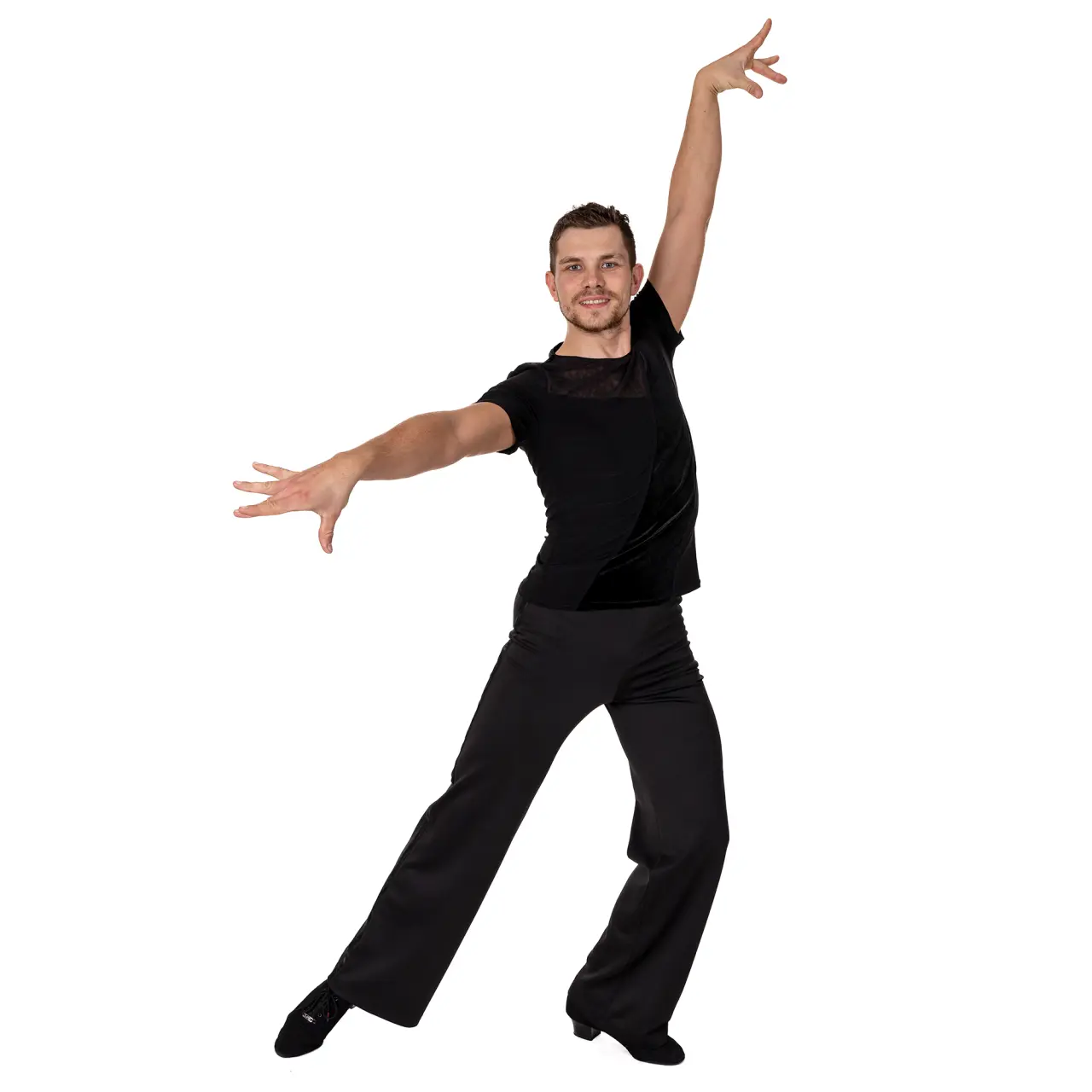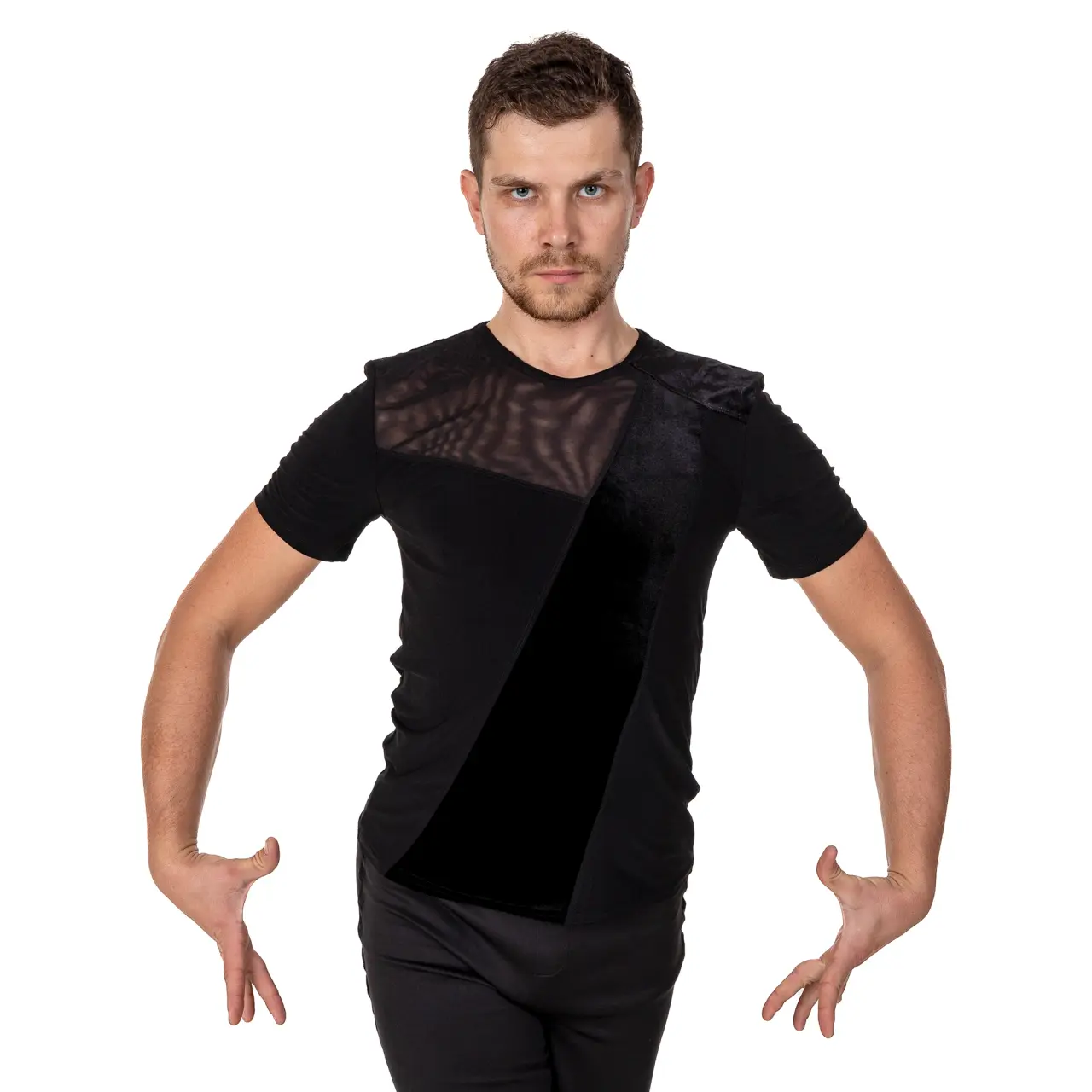Herren-T-Shirt geeignet für alle Gesellschaftstänzer. Das T-Shirt hat kurze Ärmel, die mit einer Einfassung abgeschlossen sind. Ein samtiges Zierband verläuft mittig über das T-Shirt und sorgt zusammen mit dem Netzmaterial im Brustbereich für einen modernen, lässigen Look. Material: 100% Polyester. Handwäsche, zum Trocknen frei hängen lassen.