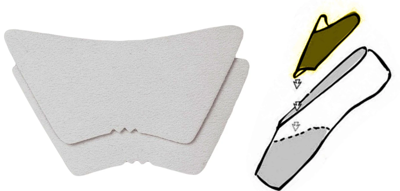 Box Liner – Einlage, die auf den Spitzenbox aufgeklebt wird und verhindert, dass der Fuß in den Box einsinkt. Sie umschließt den Spann und die Seiten des Fußes und reduziert den Druck von der Oberseite des Box. Geeignet für dünne, schmale Füße. Erhältlich in den Größen S/M und M/L. S/M ist geeignet für schmale Boxen, M/L für mittelbreite bis breitere Box-Typen. Bei Bedarf können sie angepasst werden.